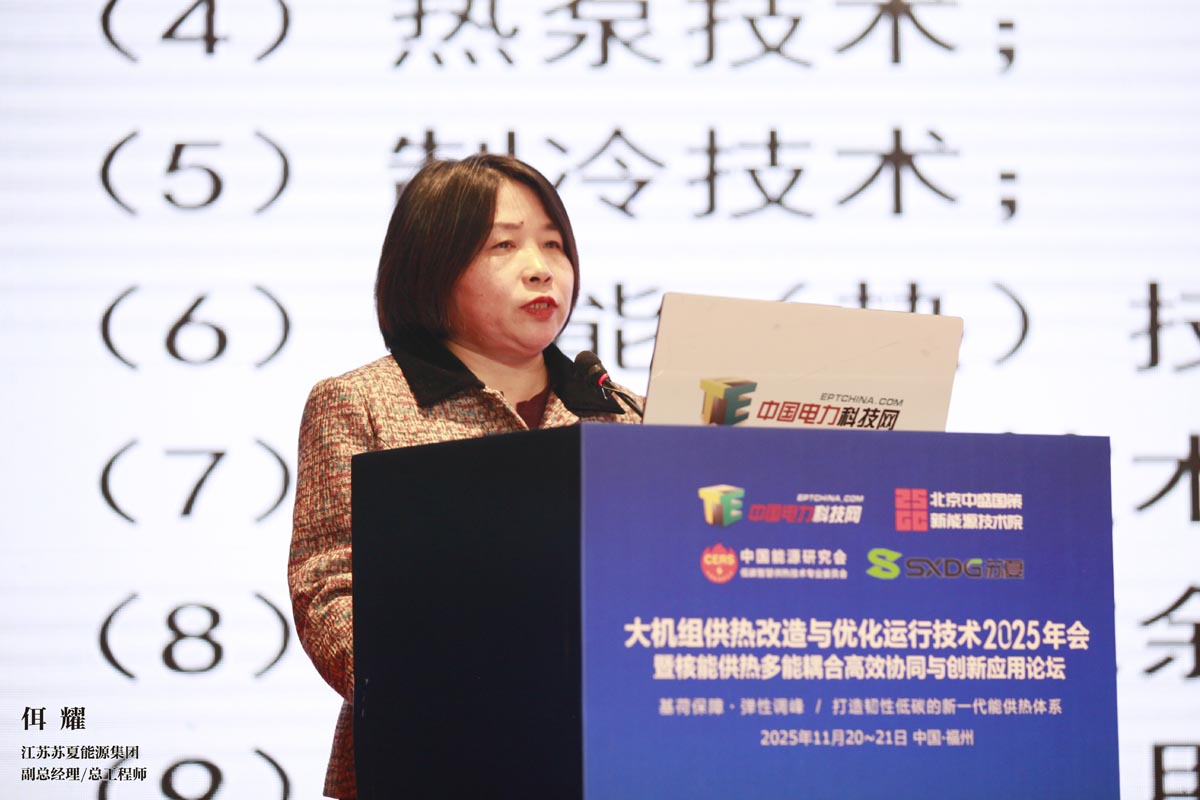 江蘇蘇夏能源集團總裁丁巧芬,代表協辦單位致辭,對參會嘉賓表示熱烈歡迎,強調了大機組供熱改造在能源轉型中的重要意義,并介紹了蘇夏能源供熱技術領域的實踐與探索。在產業升級和市場迭代的背景下,蘇夏能源集團為構建核心競爭力,實現高質量發展,提出“四大兩精”業務布局:以大熱網、大熱工、大管廊、大材料為核心的四大板塊,聚焦能源與基礎設施領域,通過規模化服務保障民生需求,支撐產業根基;以精總包、精化工為中心的兩精領域,立足專業化與精細化,憑借定制化服務與高附加值產品,搶占產業鏈的高端環節。