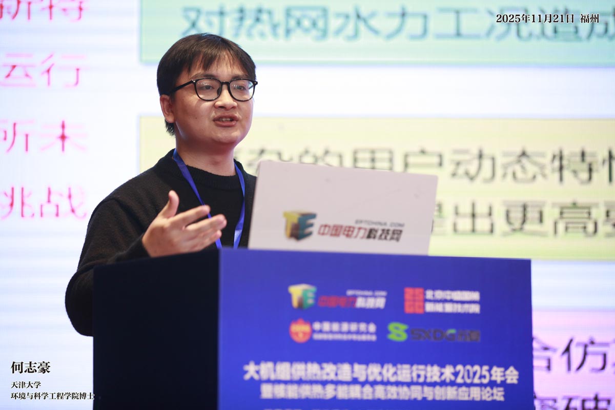 天津大學環境科學與工程學院何志豪博士,代表特聘研究員王雅然,發表“火電深調背景下的城市大熱網動態仿真與優化調度”演講,核心是探討熱網技術演進、現存問題、低碳化路徑及核心技術突破。他指出,熱網已歷經五代發展,正朝著高能效、高靈活性、低排放、智能化方向邁進,需應對可再生能源接入、與電網協同等新挑戰;我國3GDH技術雖具備多熱源、復雜管網結構等特點,但存在低品位余熱集成難、調節靈活性不足、依賴化石能源等瓶頸,智能化是重要突破方向。在此基礎上,提出大熱網低碳化應采用“集中式余熱互補+分布式調峰/儲能”轉型模式,即保留部分熱電廠,推廣分布式可再生熱源并實現熱網彈性化、智慧化調控,同時介紹了研發的動態仿真調度平臺與換熱站智能優化算法平臺,這些技術可解決水力熱力仿真、優化調度等問題,已落地應用并實現節能降耗,能保障供熱安全穩定。